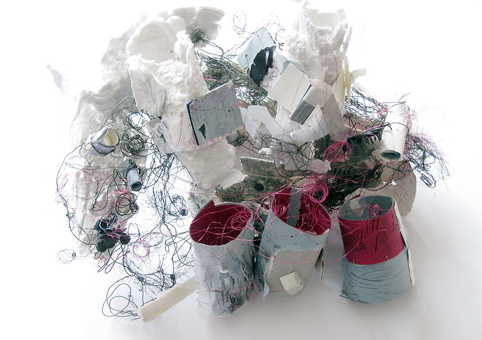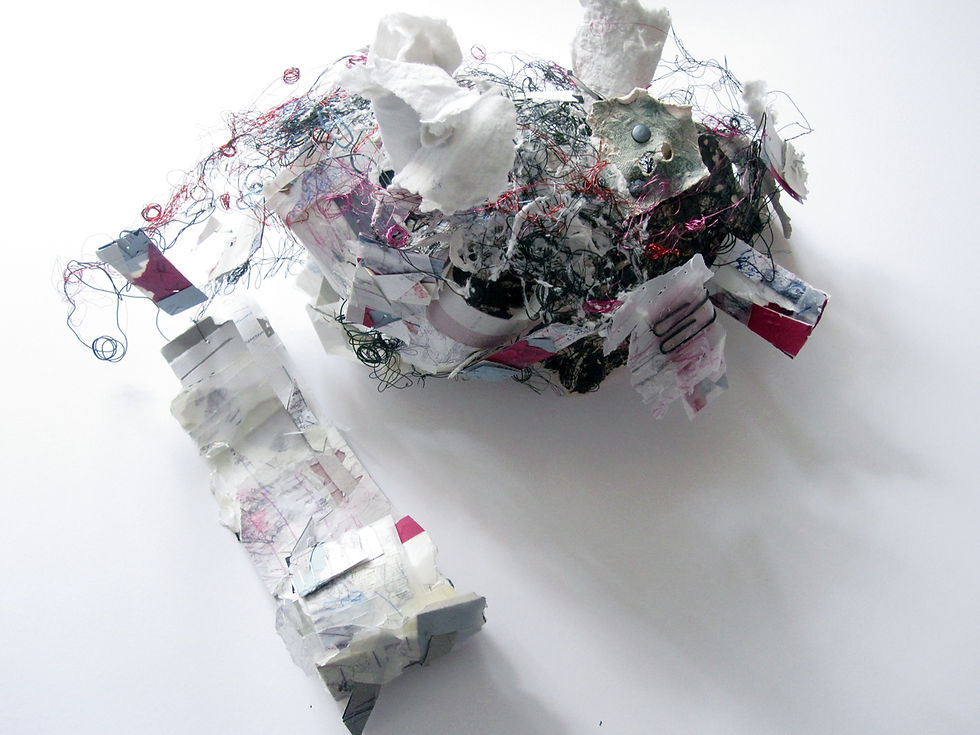 These are my latest sculptures, still not quite finished yet! They run along similar themes to the previous black and white sculptures. I have applied a matt glaze to the ceramic components, and a wider variety of coloured papers in the drawing elements. Home made paper also features, which is an element I want to develop at a later date.